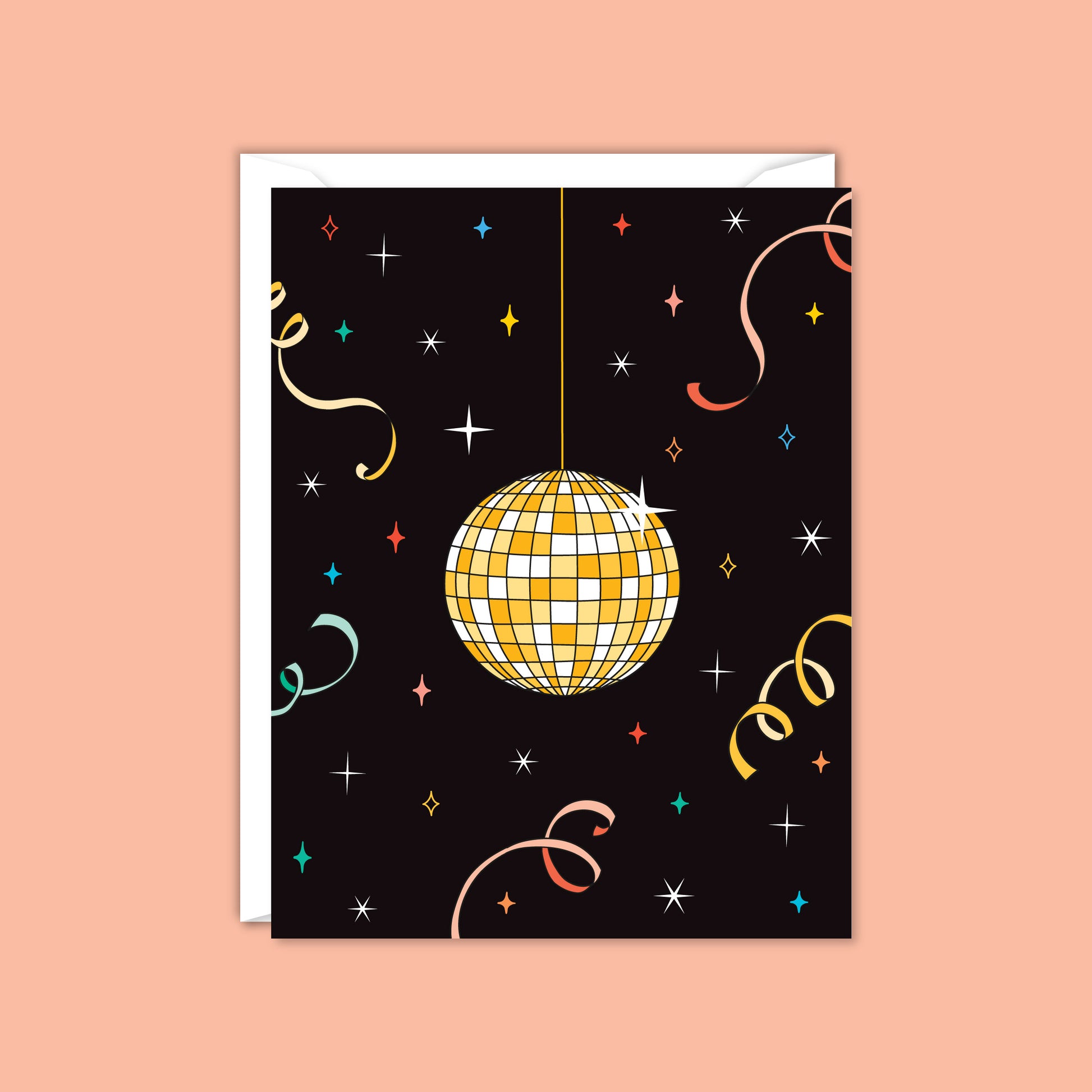 A retro inspired Disco party card with colorful streamers and disco ball- Perfect for New year's party, a birthday or a graduation party.