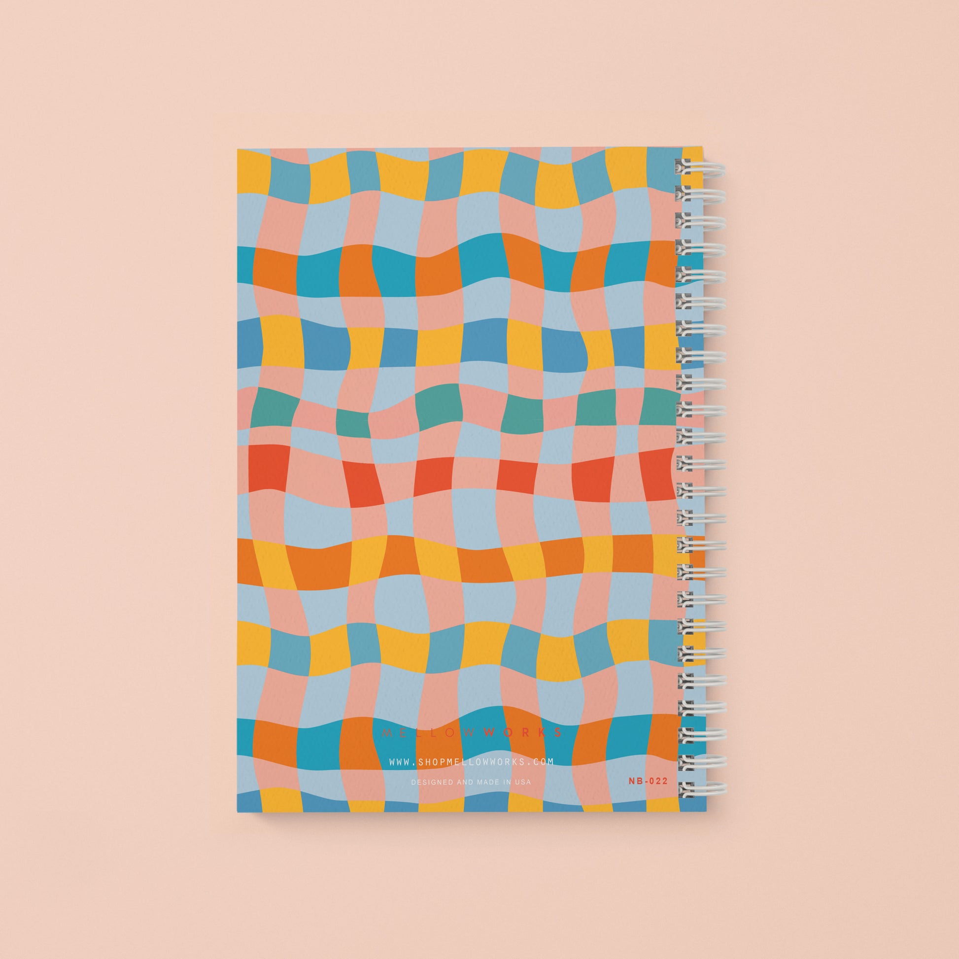Our colorful WAVY CHECKERS NOTEBOOK in a fun modern checkerboard pattern is sure to turn heads! It comes with a heavy cardstock cover with blank pages and is perfect to carry in a bag all day or brighten a desk with its bold design. The coil binding makes it easy to lay the book flat for easy sketching, doodling, everyday note taking or writing. And there's a fun pop of color when you open the notebook!