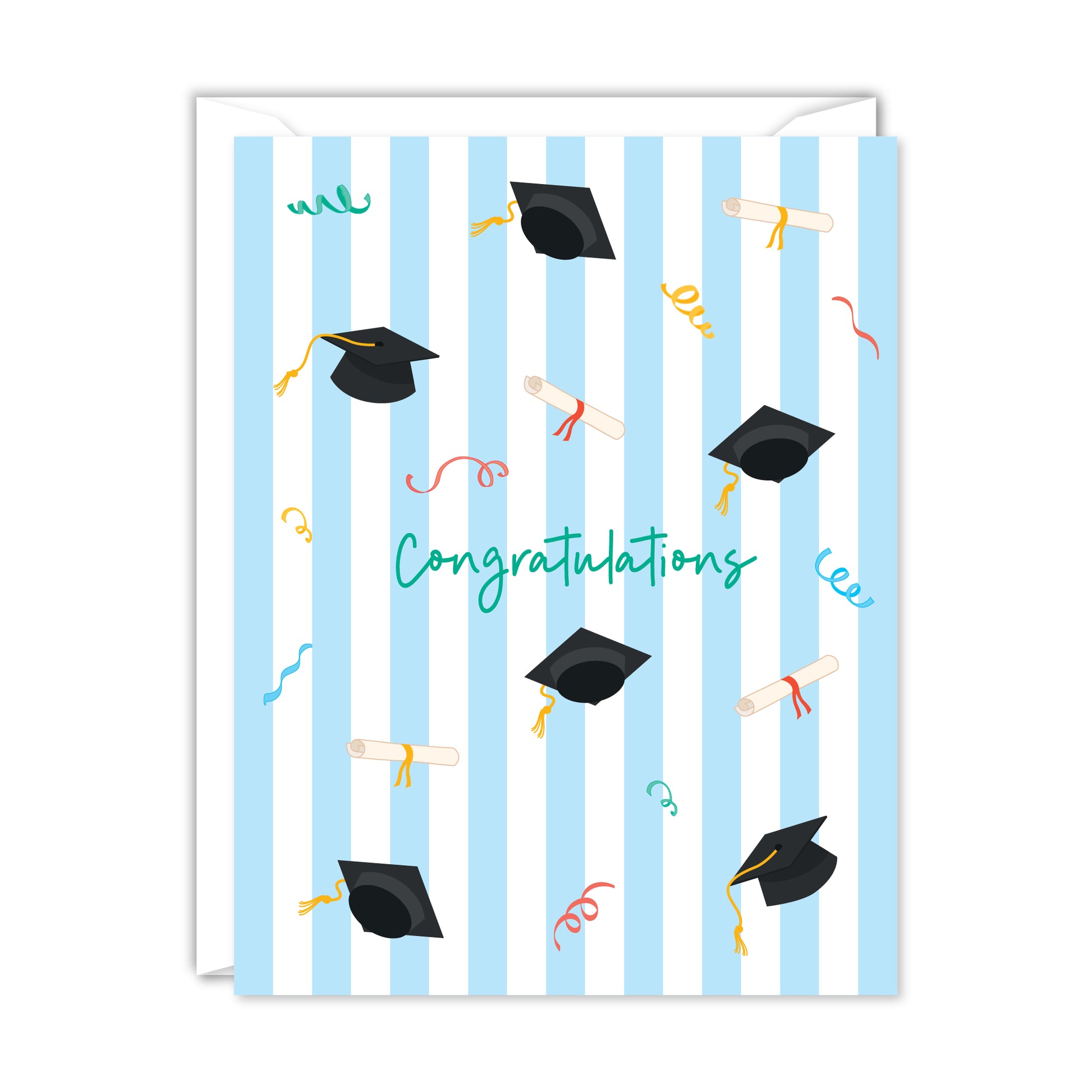 A fun card to congratulate the graduates with caps toss and diplomas on a blue collegiate stripe background