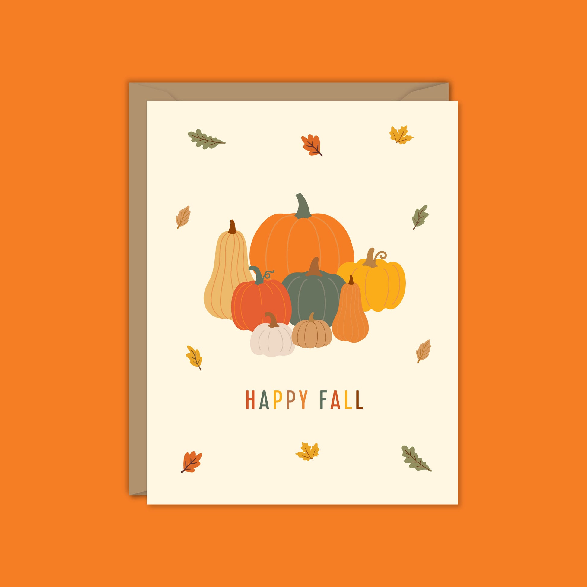 A colorful pumpkin decor card to wish a Happy Fall. A perfect card to accompany your hostess gift, for fall festivities or as a Thanksgiving card.