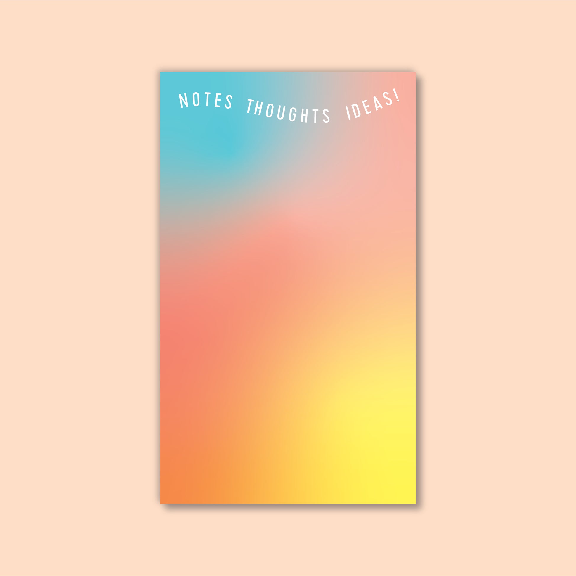 Put down your "Notes Thoughts and Ideas' on this light and breezy sunset ombre notepad. Perfect size to carry in a bag all day or brighten a desk.