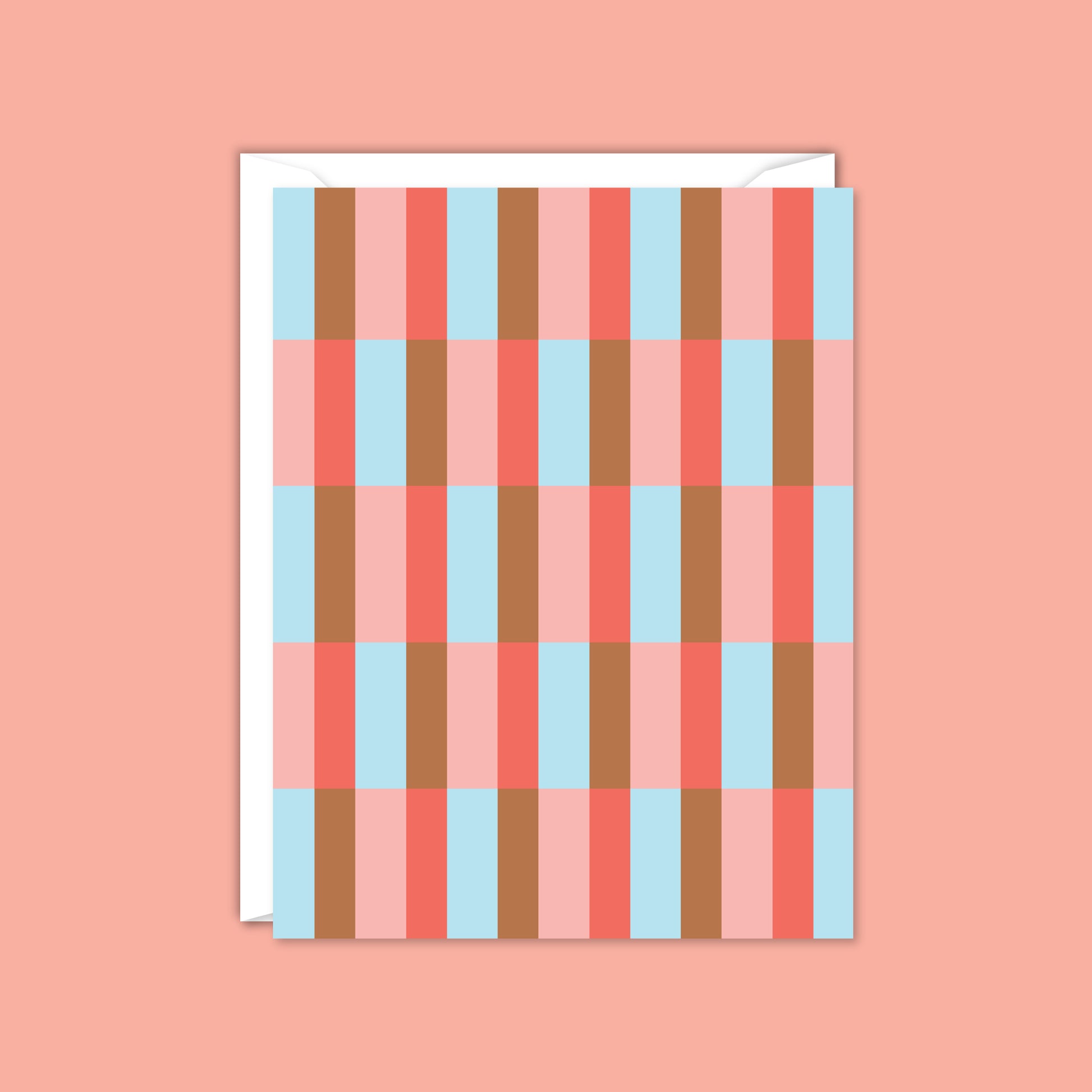 A modern card in a striped checkerboard pattern in brown, blue and red. Great to have handy for birthdays, house warming, thank you, graduation or as a thinking of you card!